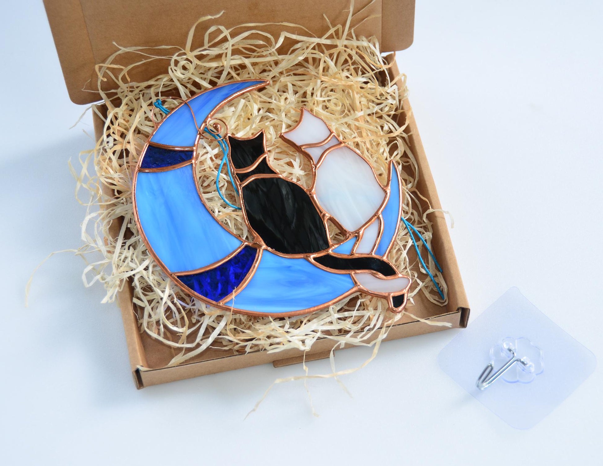 Stained glass cats on moon hangings decor, handmade suncatcher for cat lover!