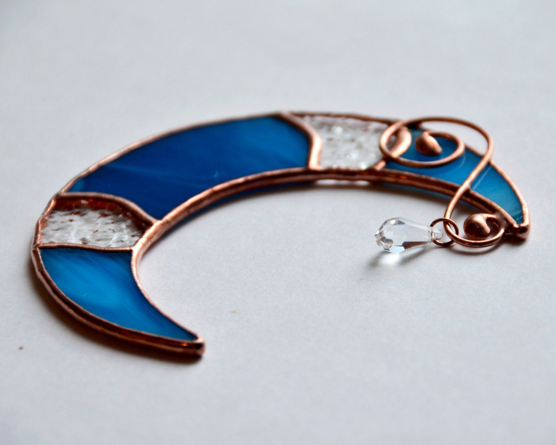 Handmade blue and clear stained glass moon suncatcher with crystal can be gorgeous decoration in your home or garden and unique housewarming gift.