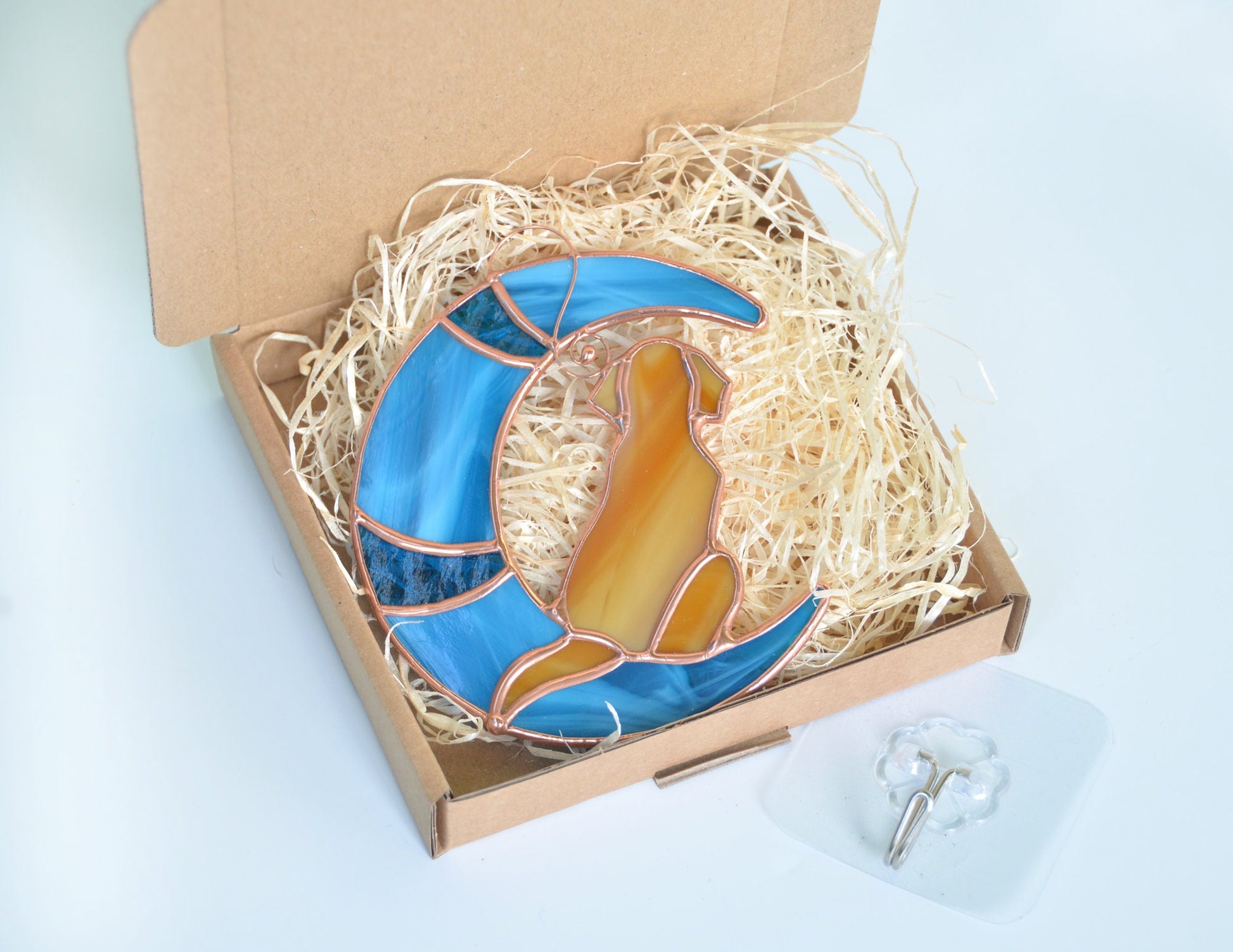 Celebrate the love you shared with your dog through this handcrafted stained glass suncatcher. Designed in the shape of a dog curled up on a crescent moon, this piece brings peace and warmth to any window, especially for those remembering a beloved pet.