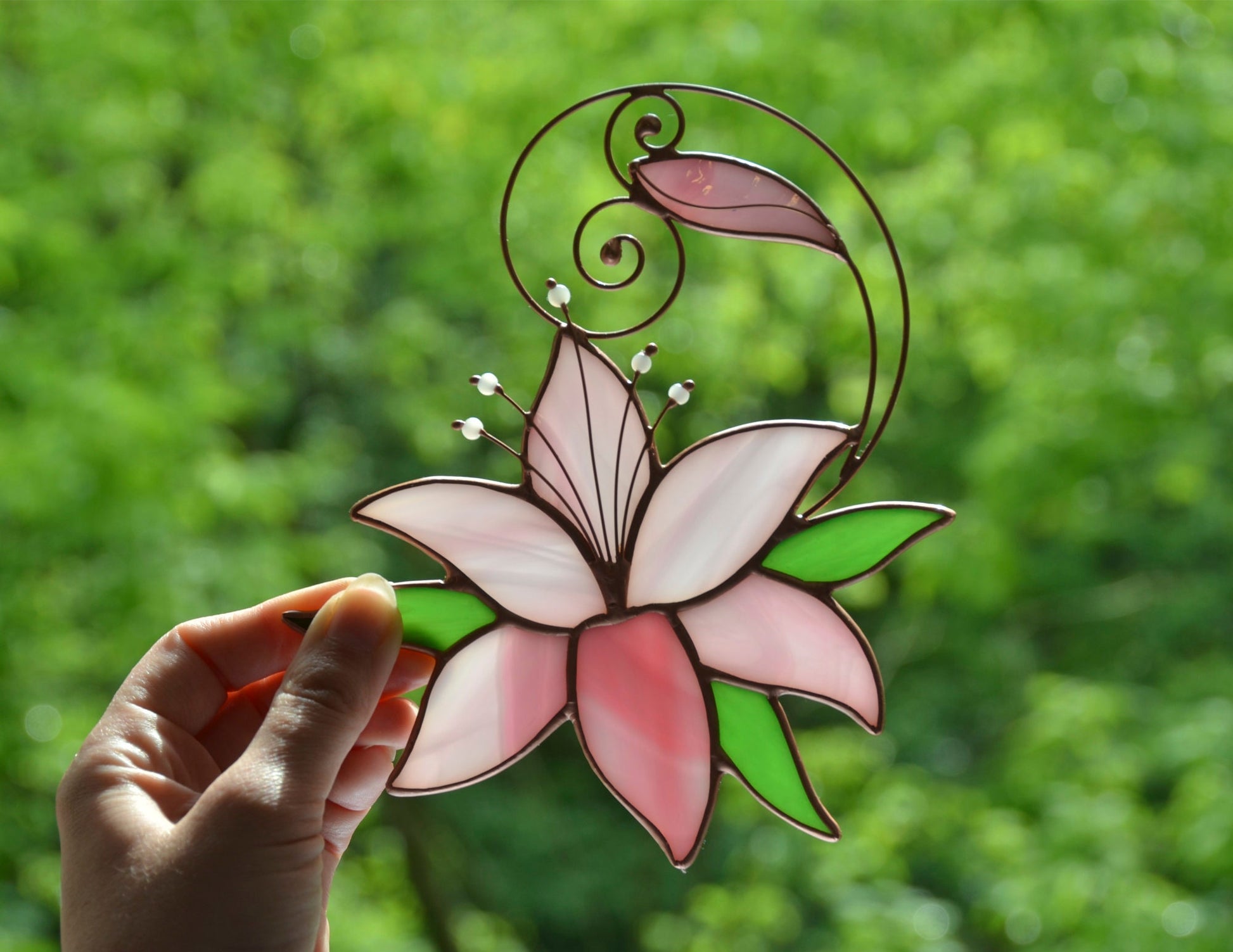 Pink stained glass lily suncatcher, unique handmade decor for your home and garden.