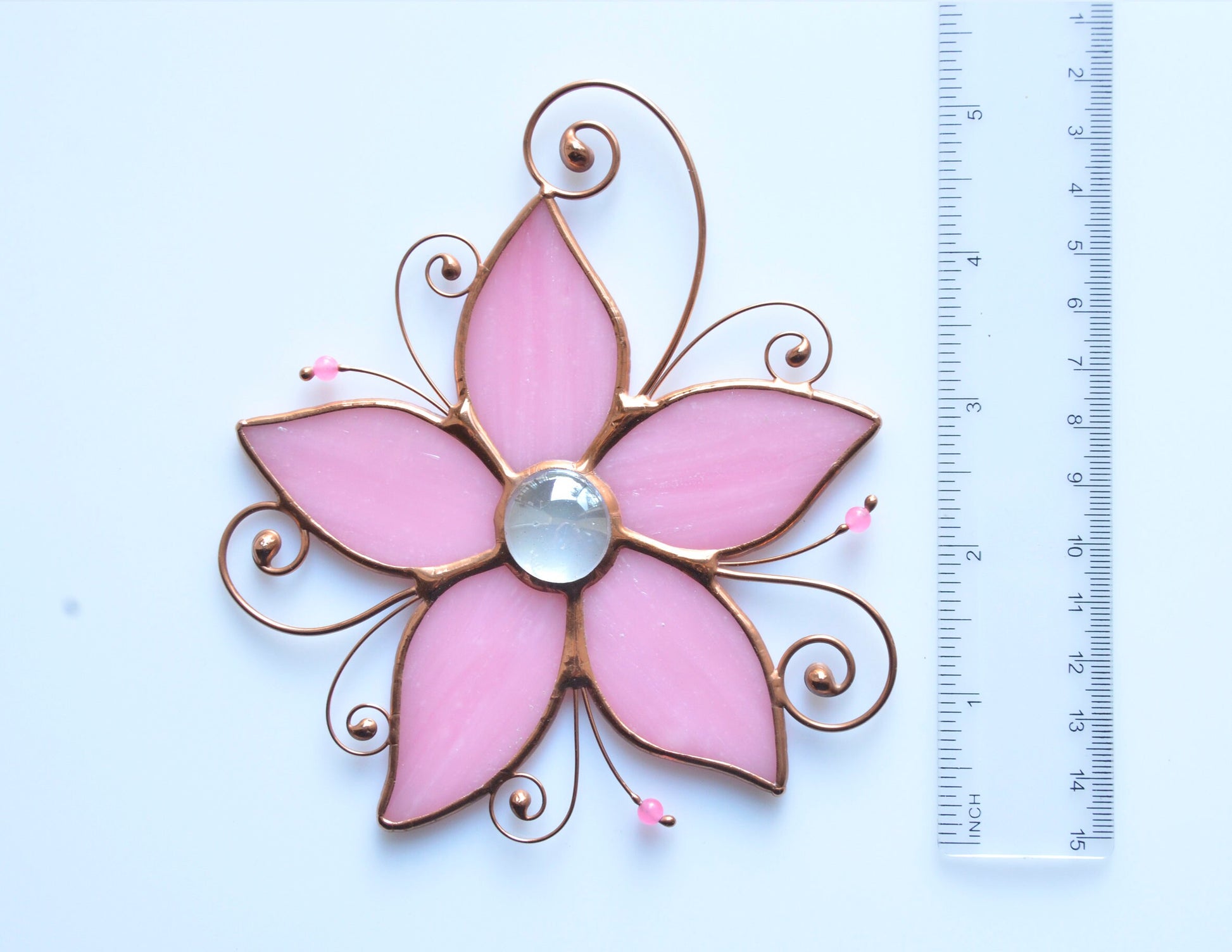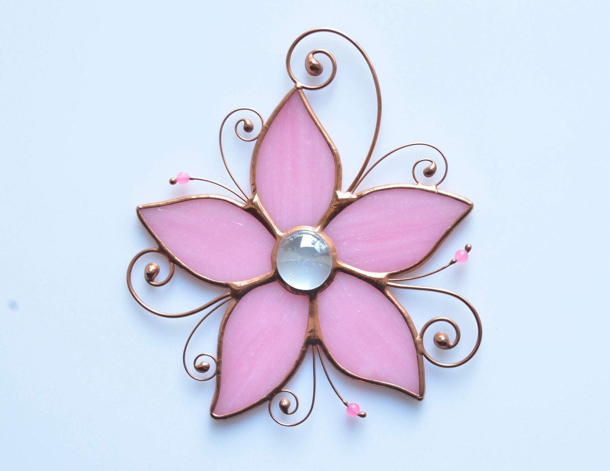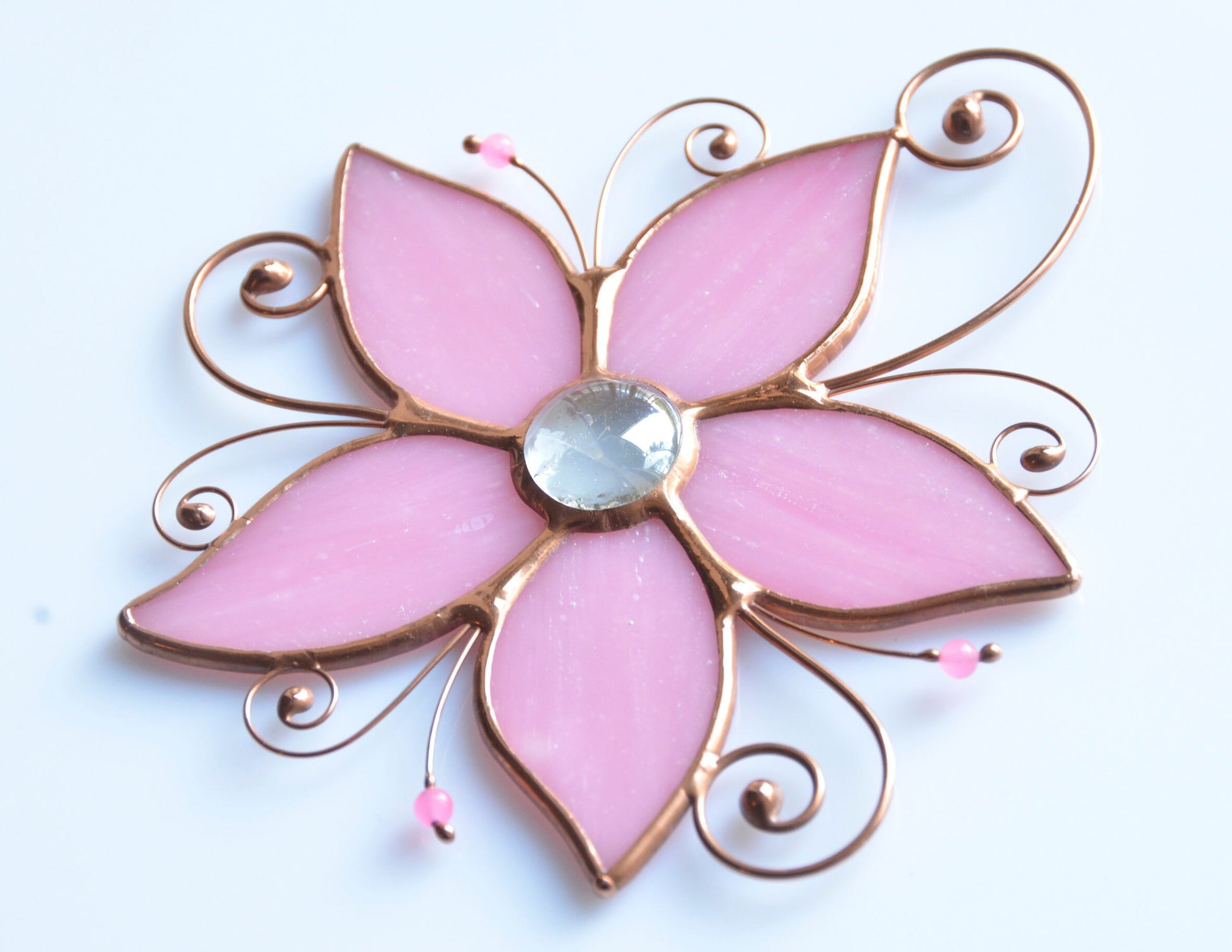 Each piece is carefully made by hand in our small home studio. We cut each glass petal, wrap it in copper foil, and solder it together using the classic Tiffany method, finished with decorative beads and copper wire for an elegant, timeless look.