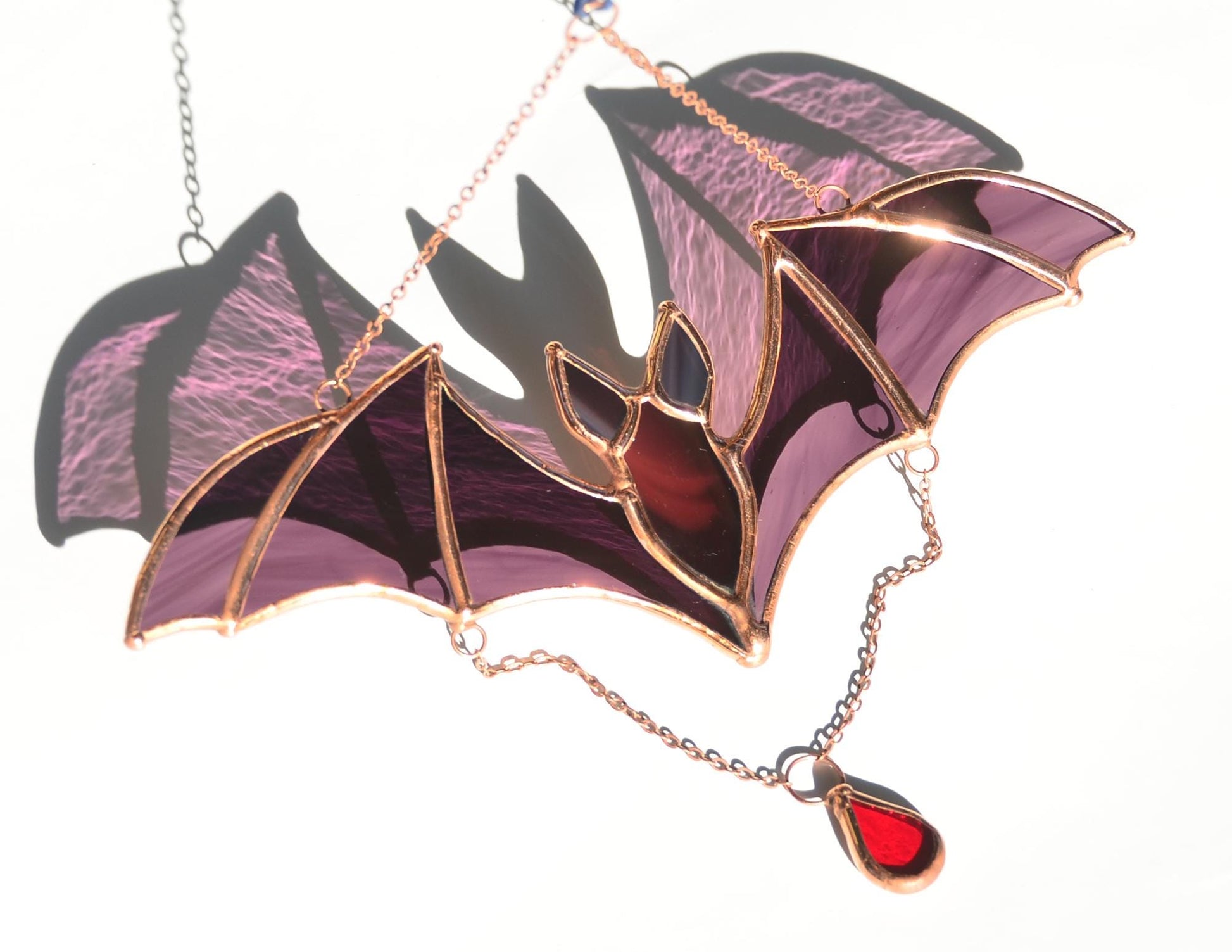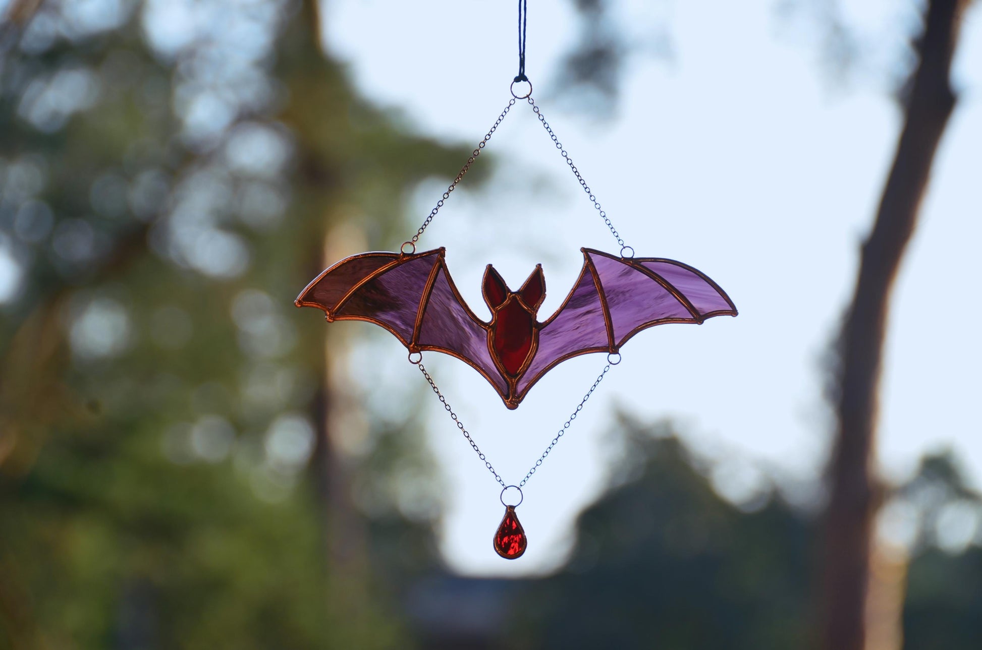 Stained glass purple bat suncatcher for your Halloween home decor.