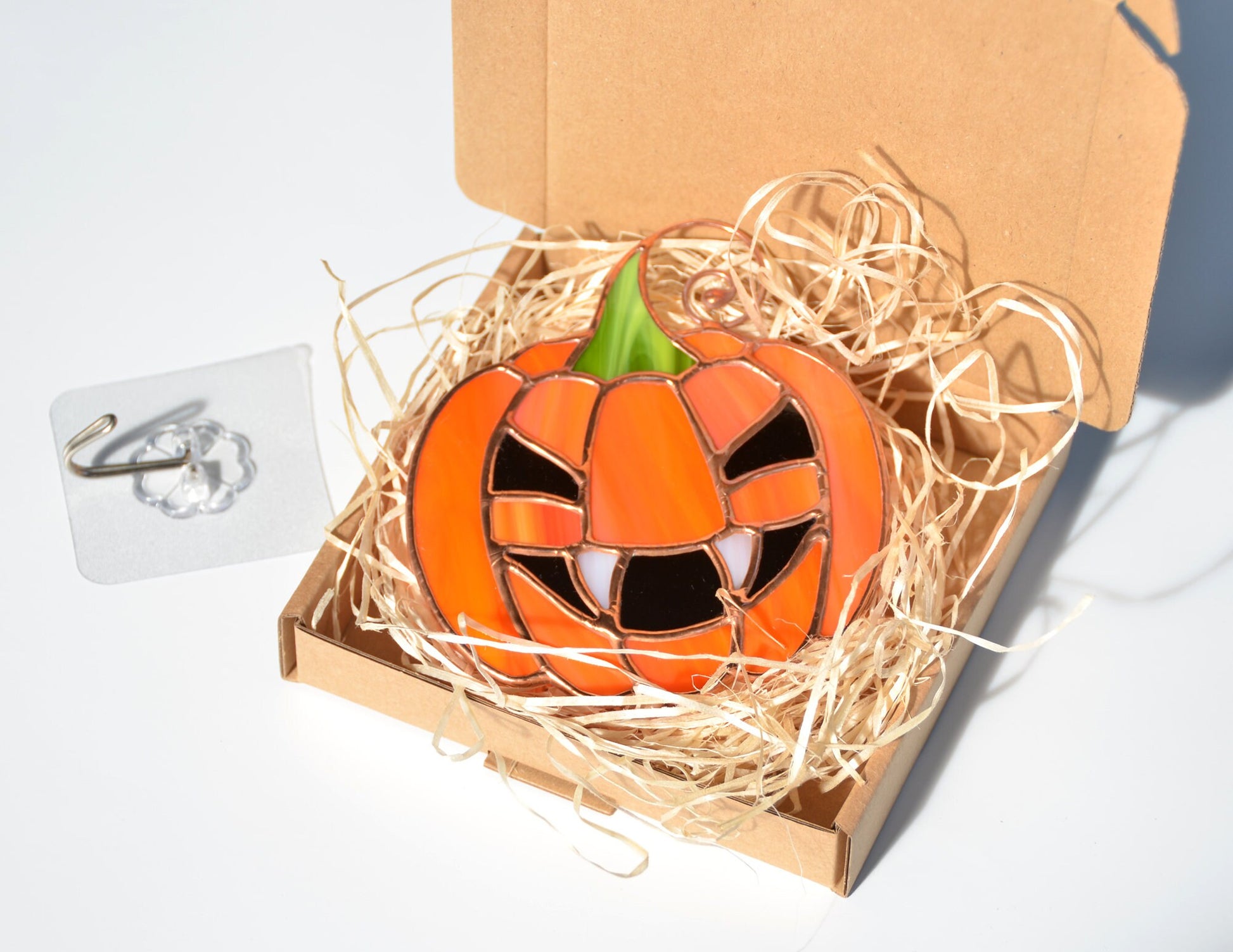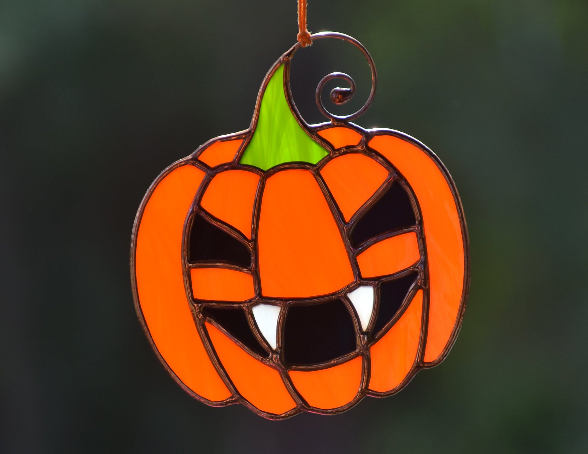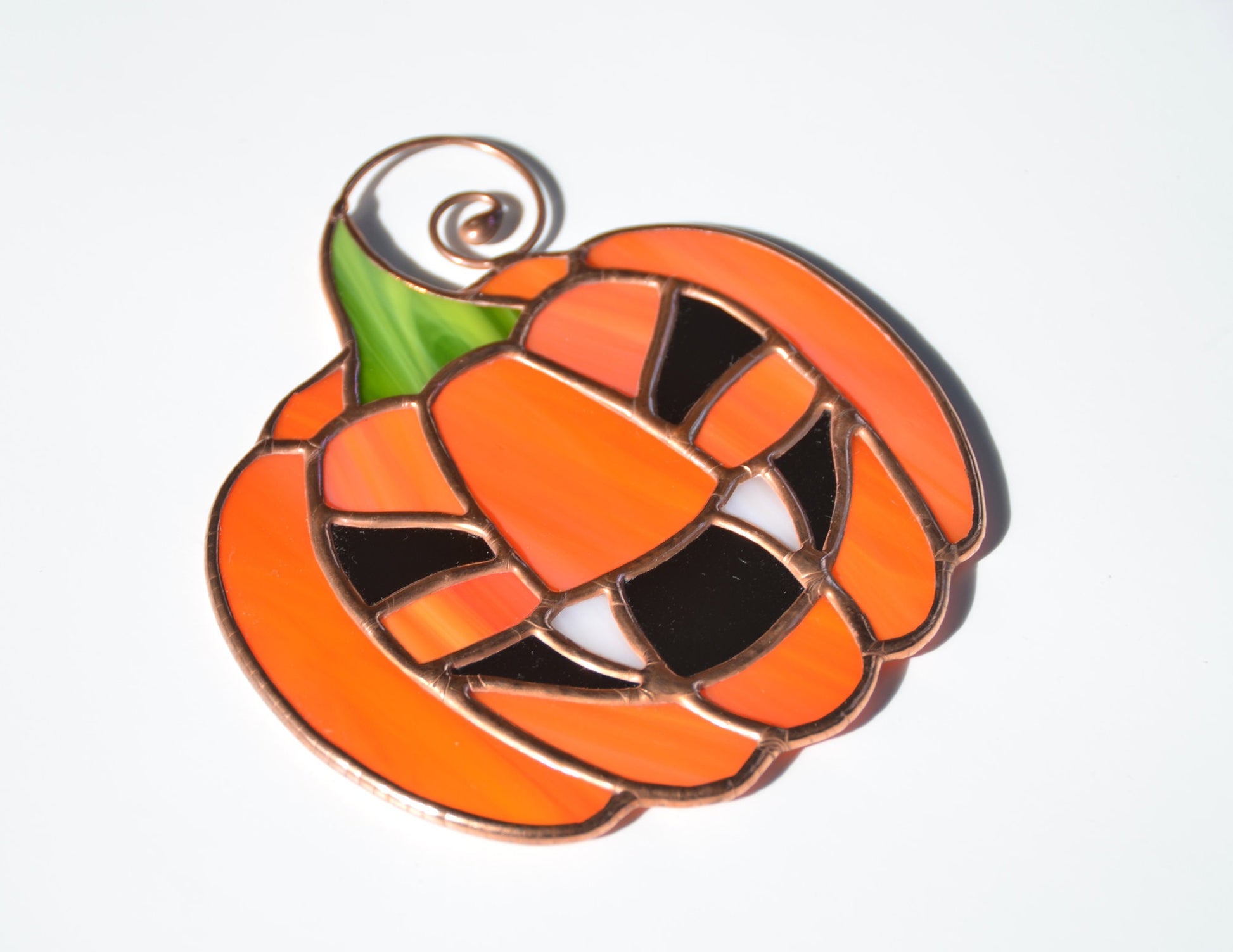 Cute stained glass pumpkin, jack-o-lantern suncatcher, perfect window Halloween decoration.