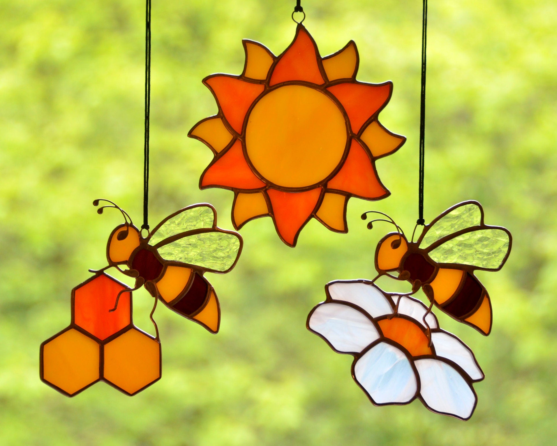 Stained glass hanging bee suncatcher for window