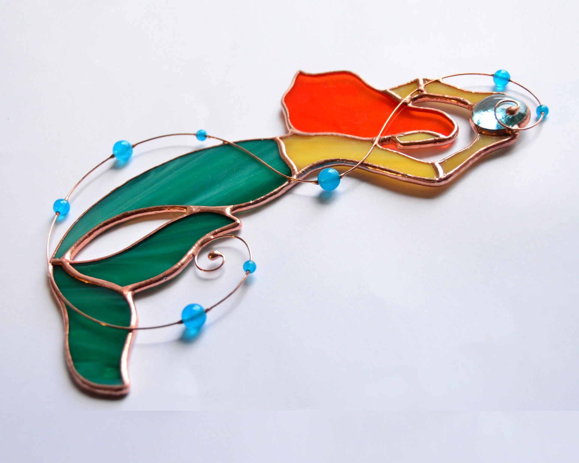 Stained glass green-blue mermaid suncatcher is unique glass art, can be a unique gift idea for your home or garden and mermaid lover.