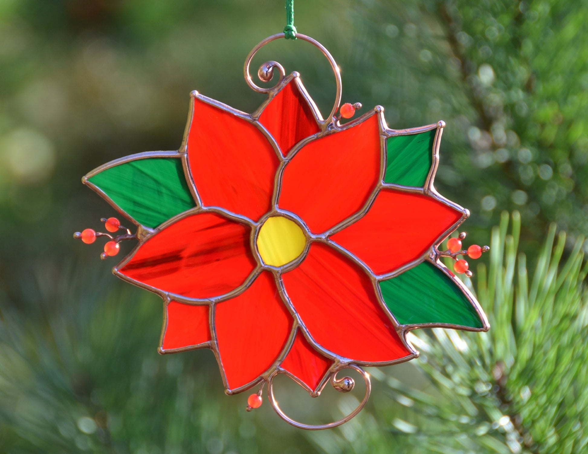 Stained Glass Poinsettia Suncatcher: Winter Flower Window Hanging