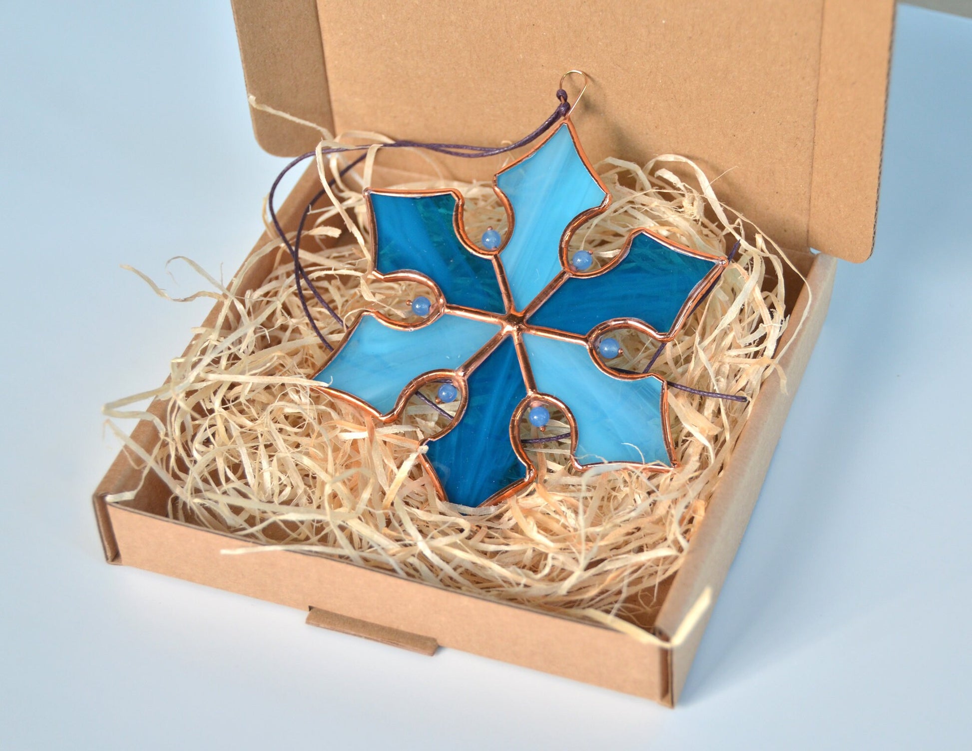 Stained Glass Snowflake Ornament – Christmas Window Hanging Suncatchers – Handmade Holiday Decor – Winter Gift – Frosted Glass Decoration