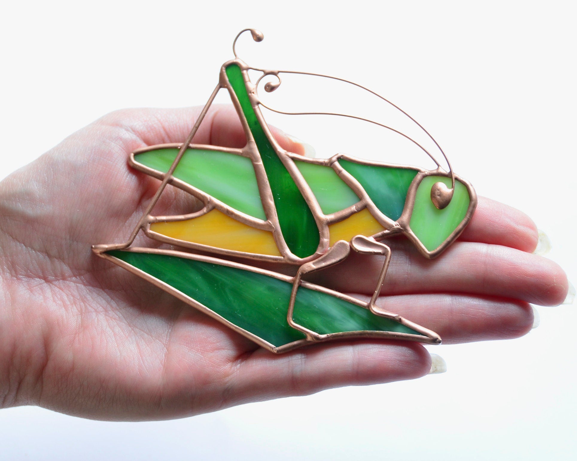 Stained glass grasshopper suncatcher is beautiful decoration for your home or garden.