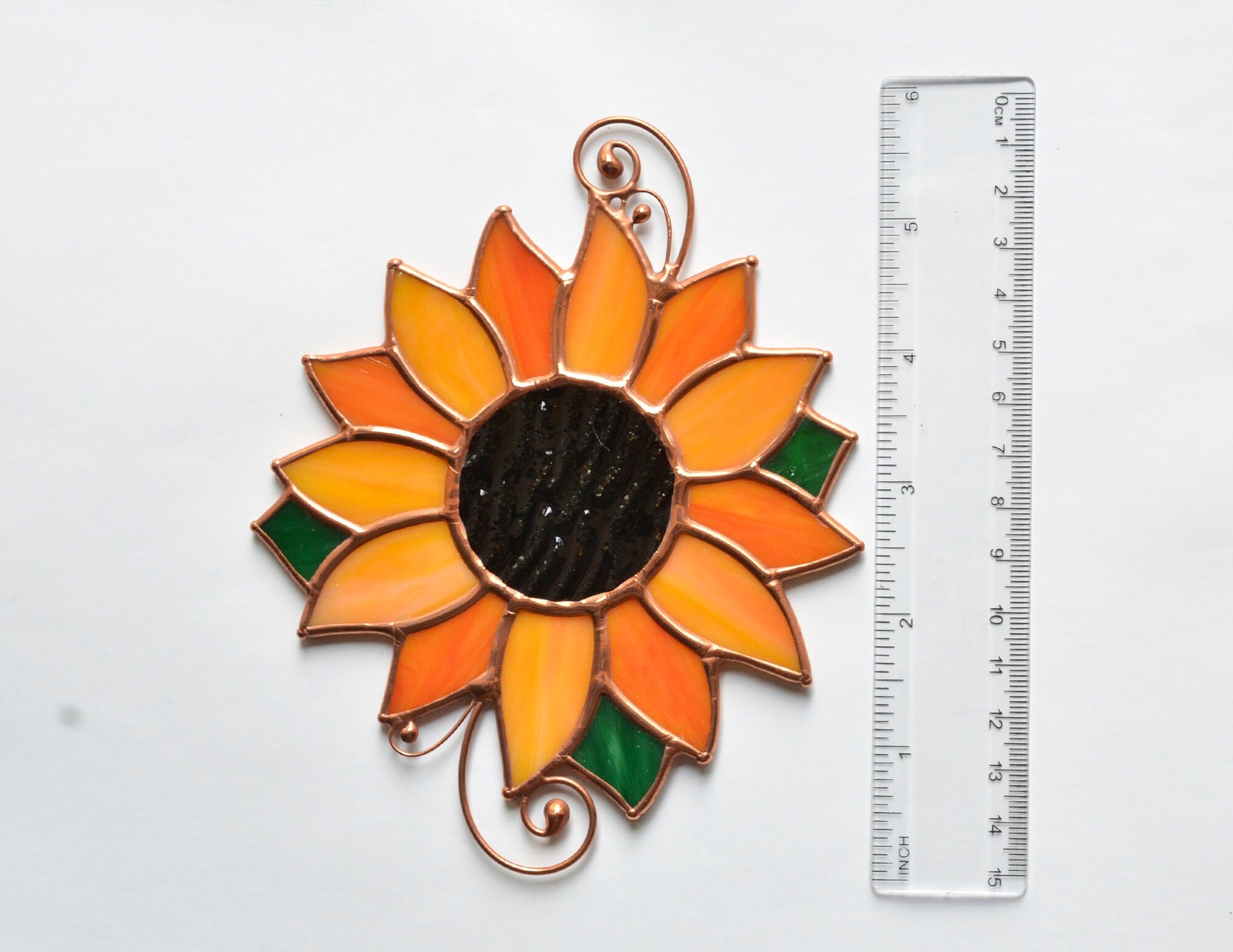 Brighten your home with the radiant beauty of this handcrafted Stained Glass Sunflower. Designed with meticulous attention to detail, this vibrant piece captures the warmth and joy of a sunflower in full bloom. The rich amber and golden tones of the petals, complemented by deep greens in the leaves, create a stunning contrast that comes to life as sunlight shines through.
