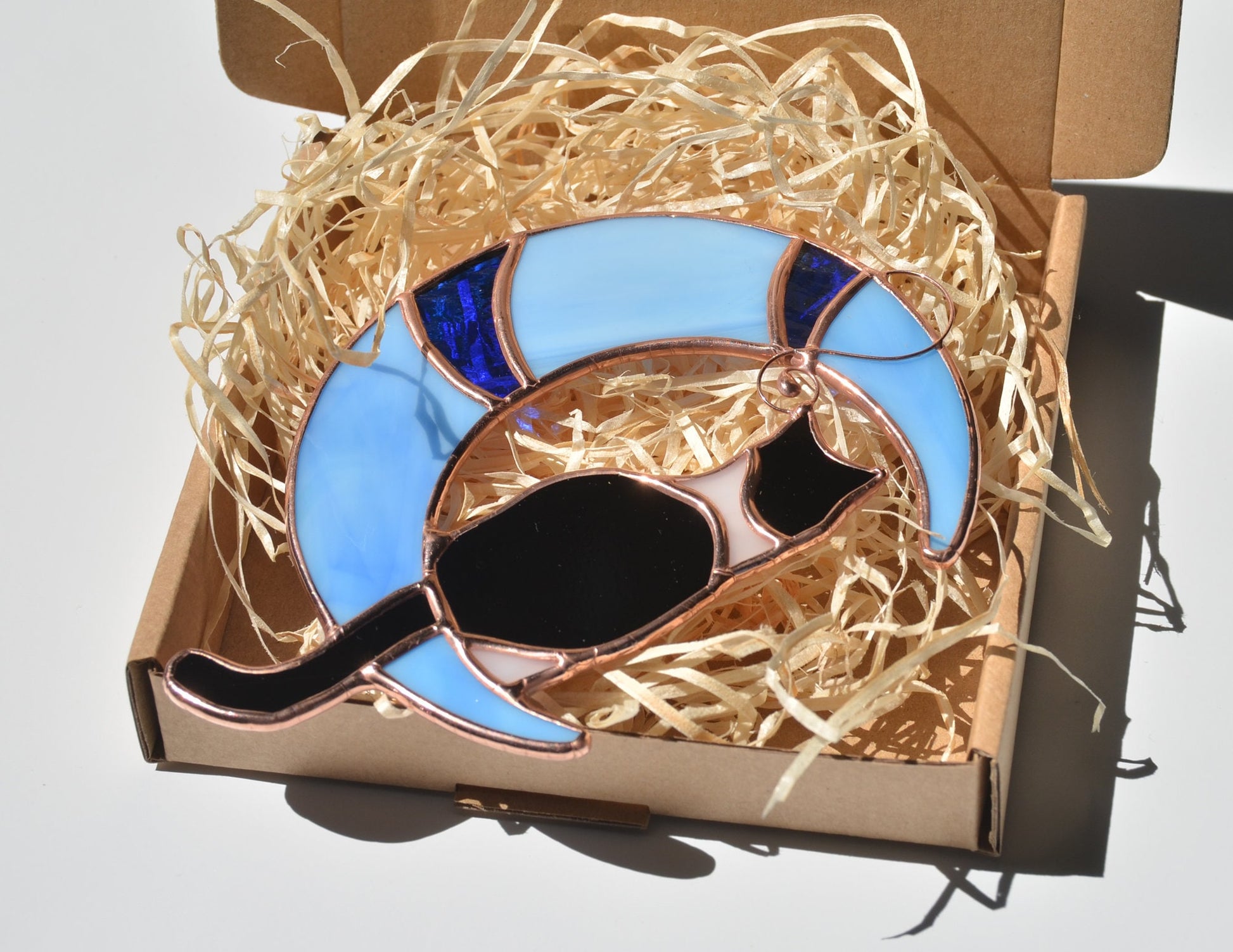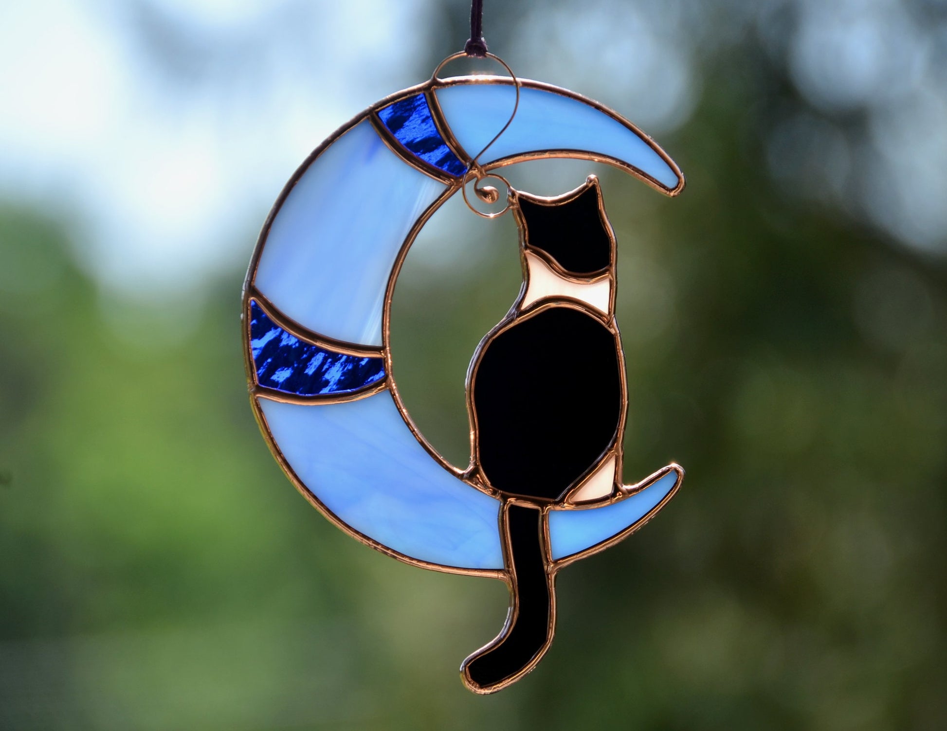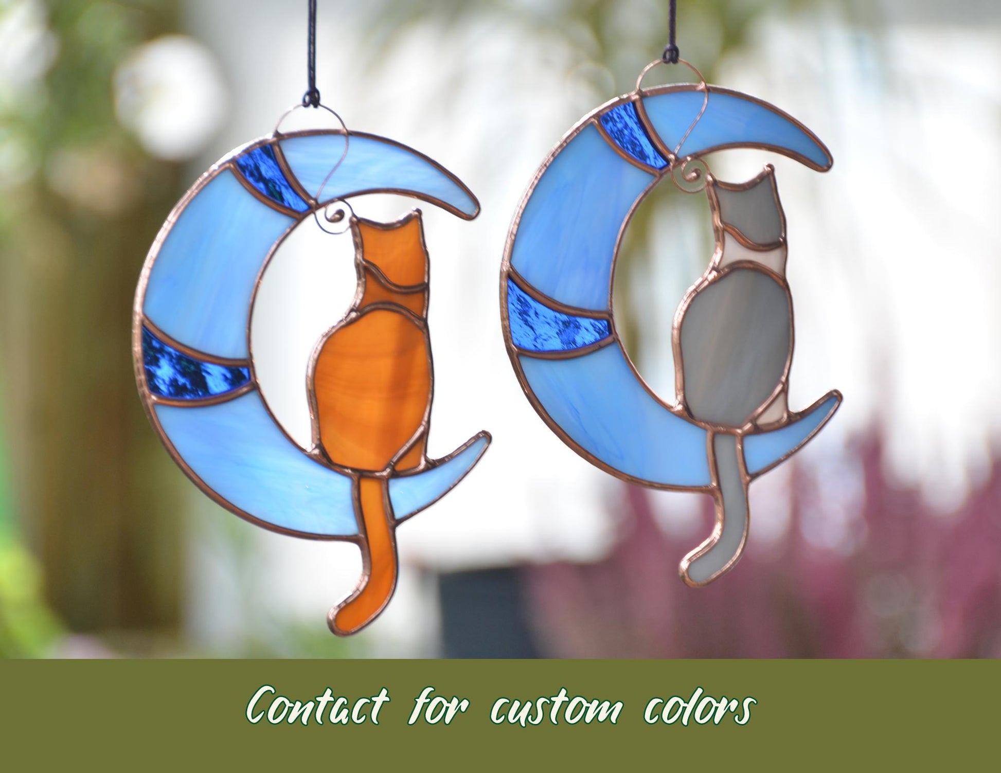 Stained glass cat on moon window hangings, handmade suncatchers for cat lover!